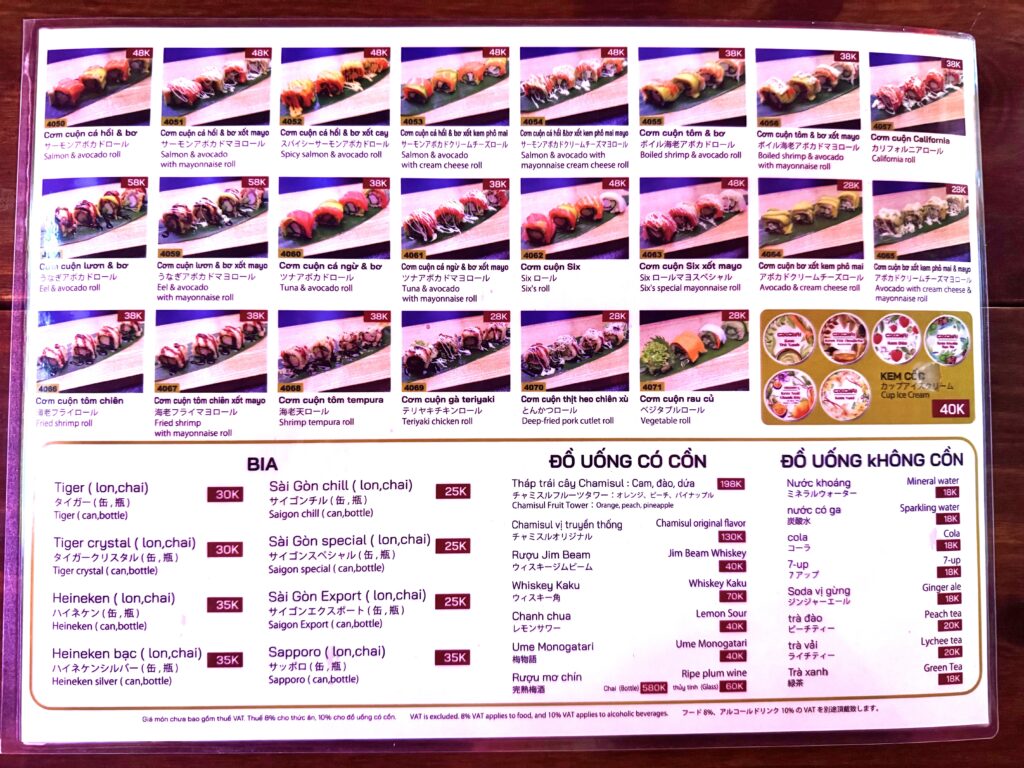 ビールはタイガー、ハイネケン、サッポロなど定番が25K〜35Kドン(約150円)、ハイボールは40Kドン(約230円)と格安。