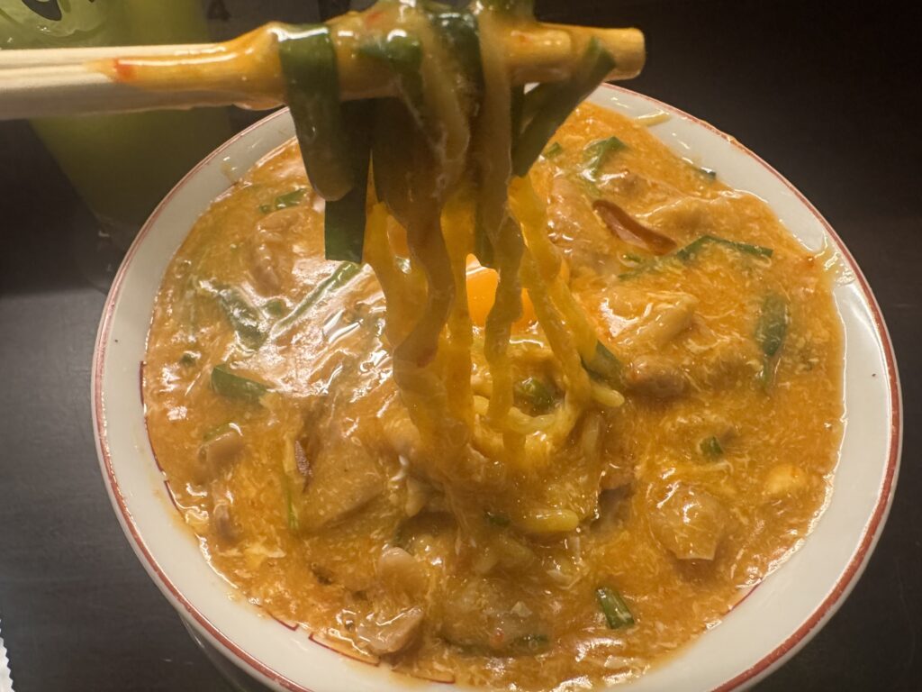 濃厚スープと対等に渡り合うのが、この麺の存在だ。太すぎず細すぎず、絶妙な中太麺はもちっとした弾力があり、とろみあるスープをしっかりと絡め取る。箸で持ち上げた瞬間、麺が黄金色に染まり、まるで一本一本が味を語っているようだ。麺、スープ、ホルモンが三位一体となり、食べるたびに味のレイヤーが積み上がっていく。